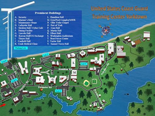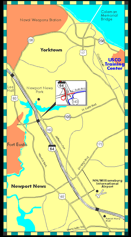 This page includes directions and key information that should be useful for first-time travelers planning a trip to Training Center Yorktown, Virginia. It includes specific directions you'll need to get to the base (including links to maps) and information about commercial transportation. Download and print the directions.