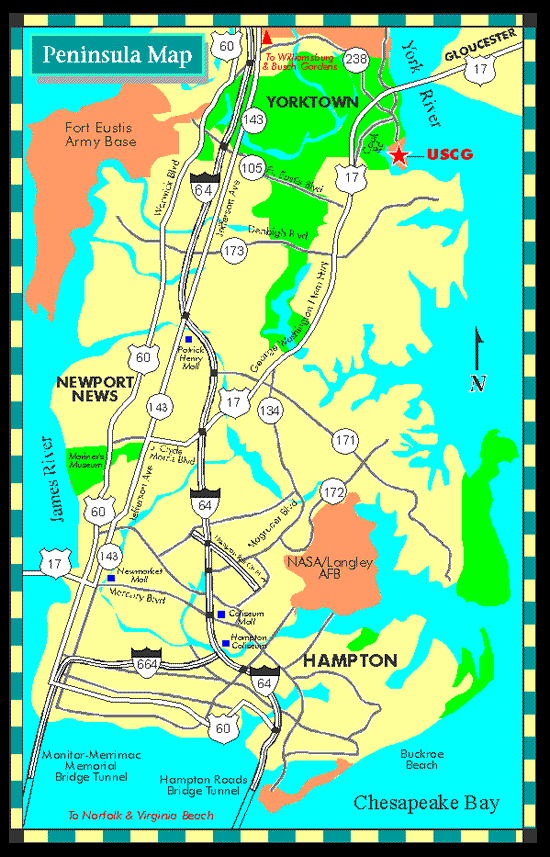Most travelers will cross over to the Peninsula via the James River Bridge (Route 17 North), the Monitor-Merrimac Memorial Bridge Tunnel (I-664), or the Hampton Roads Bridge Tunnel (I-64 West). The major roads/routes described in the directions are displayed in the appropriate maps section. Directions to TCYorktown these areas are: