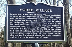 Old Yorke Village - Church Site. The village was settled in 1630 and quickly became a key religious, social, and municipal center until it was eventually replaced by Yorktown (upriver) in the late 1690's. Take a stroll to the village's site to view the gravestone of Major William Gooch (died 1655) one of the oldest legible tombstones in the New World. Artifacts from the site are also displayed in Thayer Hall.